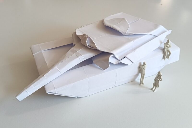 Performance – Temporäre Installation Julius-Leber-Kaserne, Berlin-Reinickendorf | 2011 Militärhistorisches Museum der Bundeswehr, Dresden | 2012 Im Februar 2011 erhielten Unicef, ProAsyl, der deutsche Flüchtlingsrat, The Voice, Karawane und andere öffentliche Flüchtlingsorganisationen eine Einladung zur Teilnahme an einem Kunstprojekt, um auf die immer dringlicher werdende Lage von Flüchtlingen jenseits der üblichen politischen Diskussionsfelder durch die Kunst aufmerksam zu machen. Im Dezember 2010 erhielt der Kommandeur 1. PzDiv. der Bundeswehr in Hannover einen Brief mit der Frage nach dem Interesse einer Kollaboration zwischen Kunst und Militär zur Herstellung des lebensgroßen Faltpanzers "LEOrigamiPARD 3" im fernöstlichen Kunsthandwerk Origami. Anfrage-1.Panzerdivision-Hannover Im Januar 2011 erklärte sich das Bundesministerium der Verteidigung nach einer Einladung zur Projektvorstellung im Bendlerblock in Berlin bereit, das Projekt zu unterstützen und erließ im Anschluss einen Befehl zur Durchführung der Faltübung mit Soldaten der Bundeswehr. BefehlBundesministeriumDerVerteidigung Zunächst wurde nach Möglichkeiten gesucht, das Projekt möglichst öffentlichkeitswirksam durch eine Faltübung von Soldaten vor dem Reichstag zu inszenieren, nachdem in den Medien über eine bevorstehende Leopard 2-Lieferung nach Saudi-Arabien berichtet wurde, verlagerte man den Origami-workshop der Soldaten in die Julius-Leber-Kaserne nach Berlin-Reinickendorf, wo unter Ausschluss der Öffentlichkeit die Faltungen durchgeführt wurden. Am 9. Juli 2012 wird der LEOrigamiPARD III durch Soldaten der Bundeswehr vor dem Militärhistorischen Museum aufgestellt, wo er im Rahmen der Museumsnacht Dresden am 14. Juli der Öffentlichkeit präsentiert und übergeben wird. Während "LEOrigamiPARd 3" Teil der Sammlung des Militärhistorischen Museums der Bundeswehr in Dresden wird, wird der von Kriesgsflüchtlingen aus Somalia, Afghanistan und Irak in der alten Desinfectionsanstalt in Berlin-Kreuzberg gefaltete lebensgroße Papierpanzer "Peacemaker" nach Beschwerden der Nachbarn von der Berliner Stadtreinigung entsorgt.