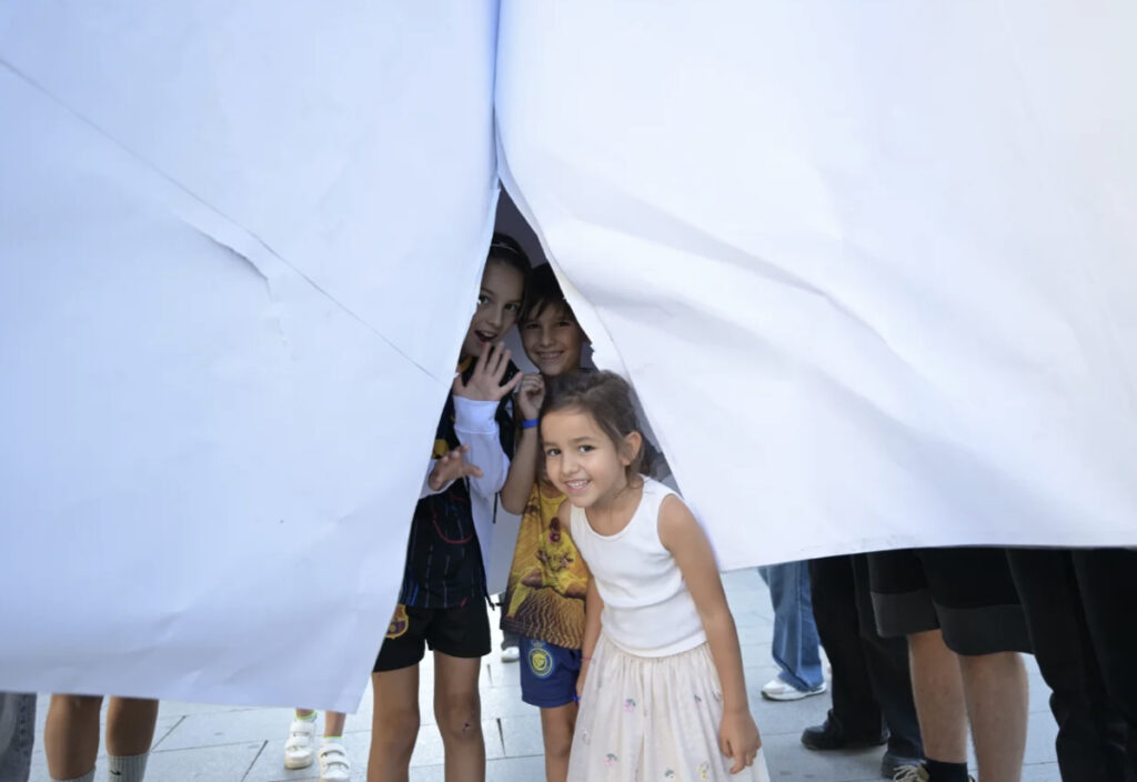 Im Vordergrund das 9 Meter lange Riesenpapierschiffchen. Eine große